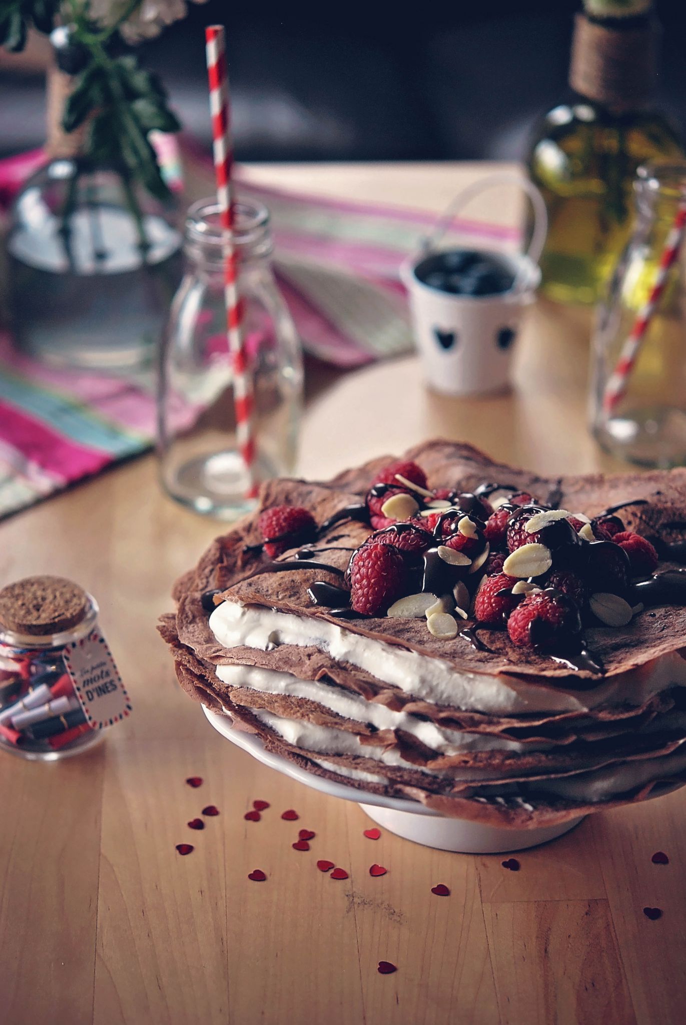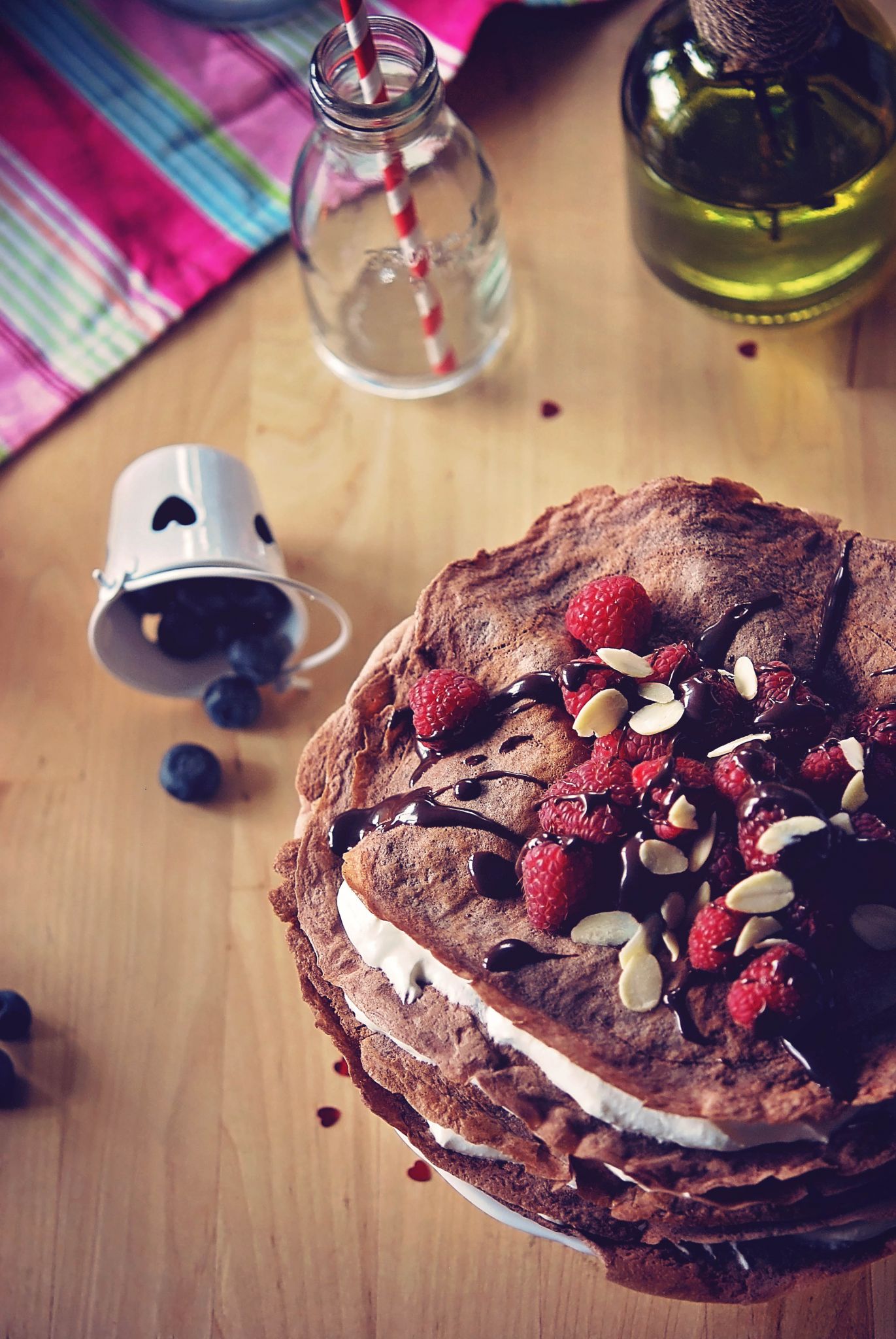 5. To serve, spread a layer of crème chantilly over one half of each crêpe, scatter with a few toasted almonds. Fold the plain half of the crêpe over the filling to enclose, then fold again into quarters. Place one filled crêpe on each serving plate and drizzle over the chocolate sauce. Scatter over a few toasted almonds, and if you wish, top with some candied orange zest.Chocolate crepes with Chantilly cream Chocolate crepes with Chantilly cream Chocolate crepes with Chantilly cream