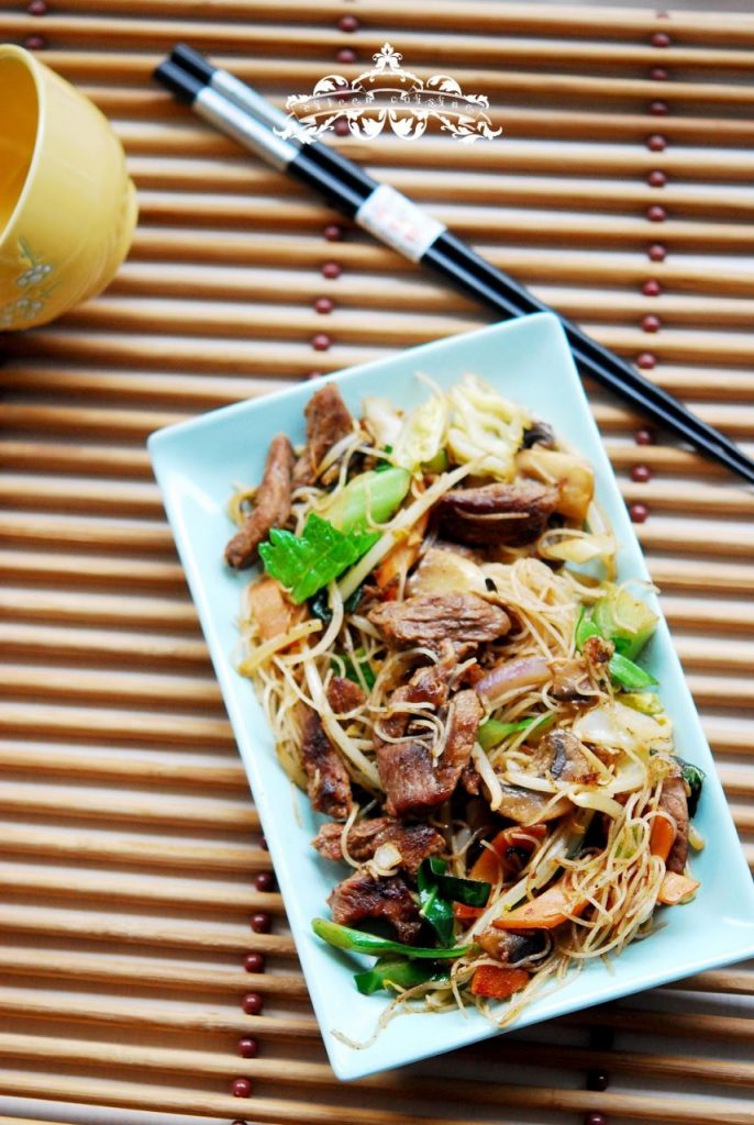 3. Add another tsp of sesame oil. Fry the vegetable mix, around 3 minutes, until it turns gold. Turn the heat higher, push the vegetables on the sides of the pan, add the rice noodles in the middle for 2 minutes, with care so they won't get stuck on the bottom.