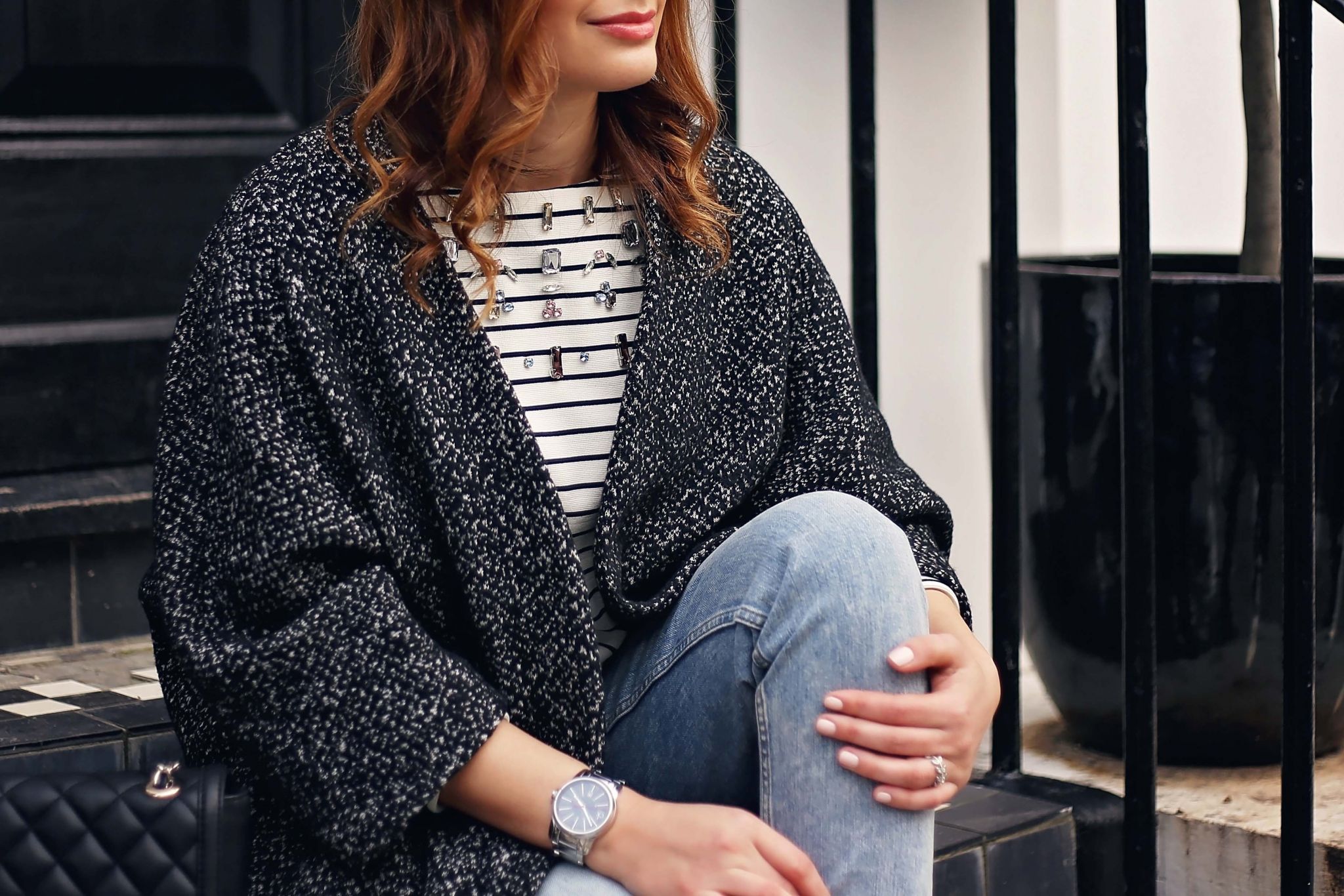 Take for example, a long coatigan and pair it with girlfriend jeans, for a casual look, but add a breton sparkly top, for that extra chic effect. Then compliment your outfit with a pair of patent tassel loafers and a classic quilted bag. Wear your elegance in flats, it’s achievable!