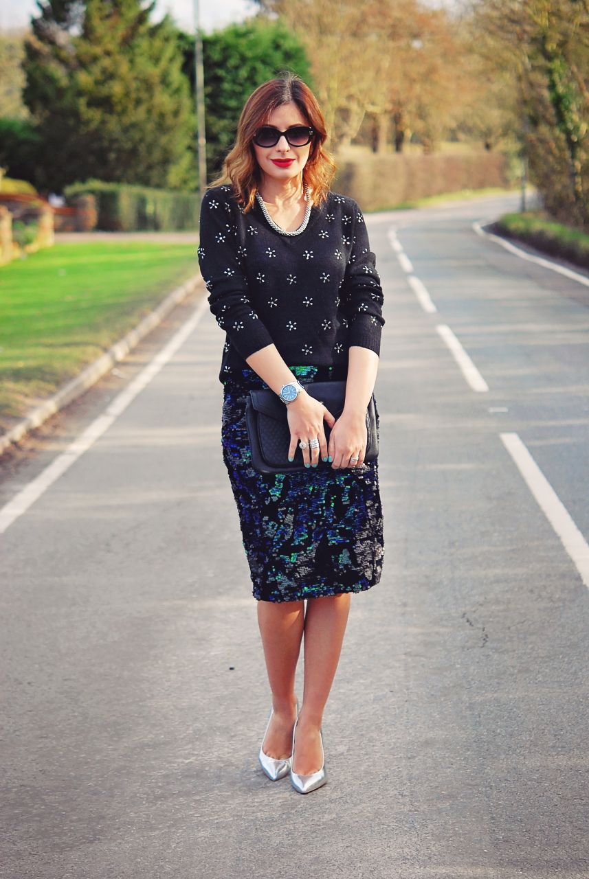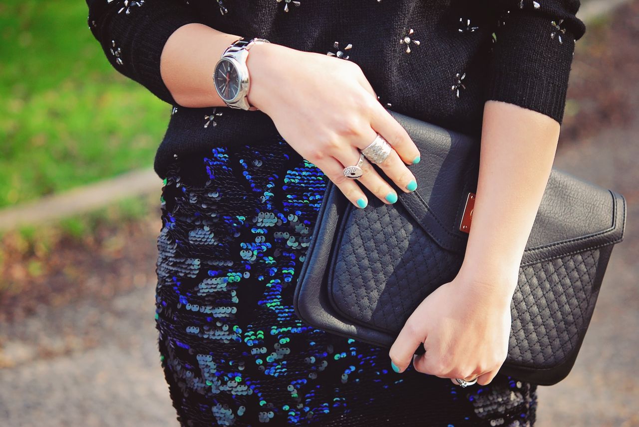 Mango jumper/Topshop skirt/Dune shoes/Warehouse clutch/Accessorize necklace/Calvin Klein watch/Folli Follie ring/Banana Republic sunglasses