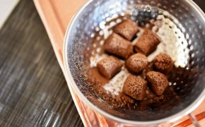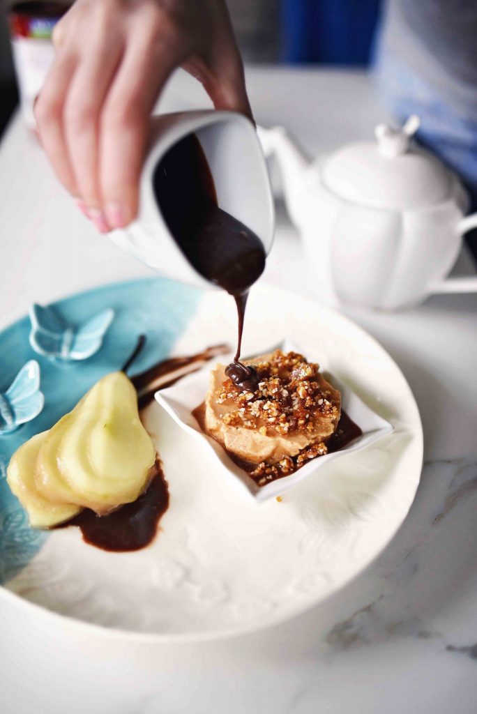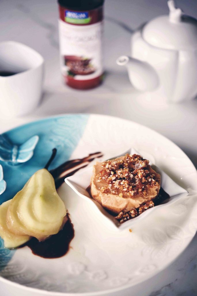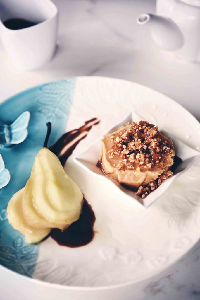 For the Queen’s birthday, I decided to prepare a delicious and scrumptious but delicate dessert, she uses to have at official dinners thrown at the Palace: Iced Praline and Amaretto Souffle with Poached Pear. The richness of the caramel is toned down by the iced praline and Amaretto liqueur, while the aromatic pear infused in cinnamon crowns the dessert in a beautiful harmony.