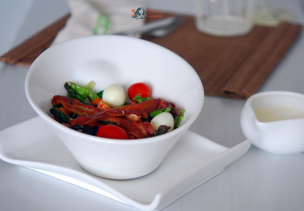 4. In a bowl, mix the salad with crayfish, asparagus, tomatoes, chopped onions and egg quail. Add the dressing and decorate with bacon.
