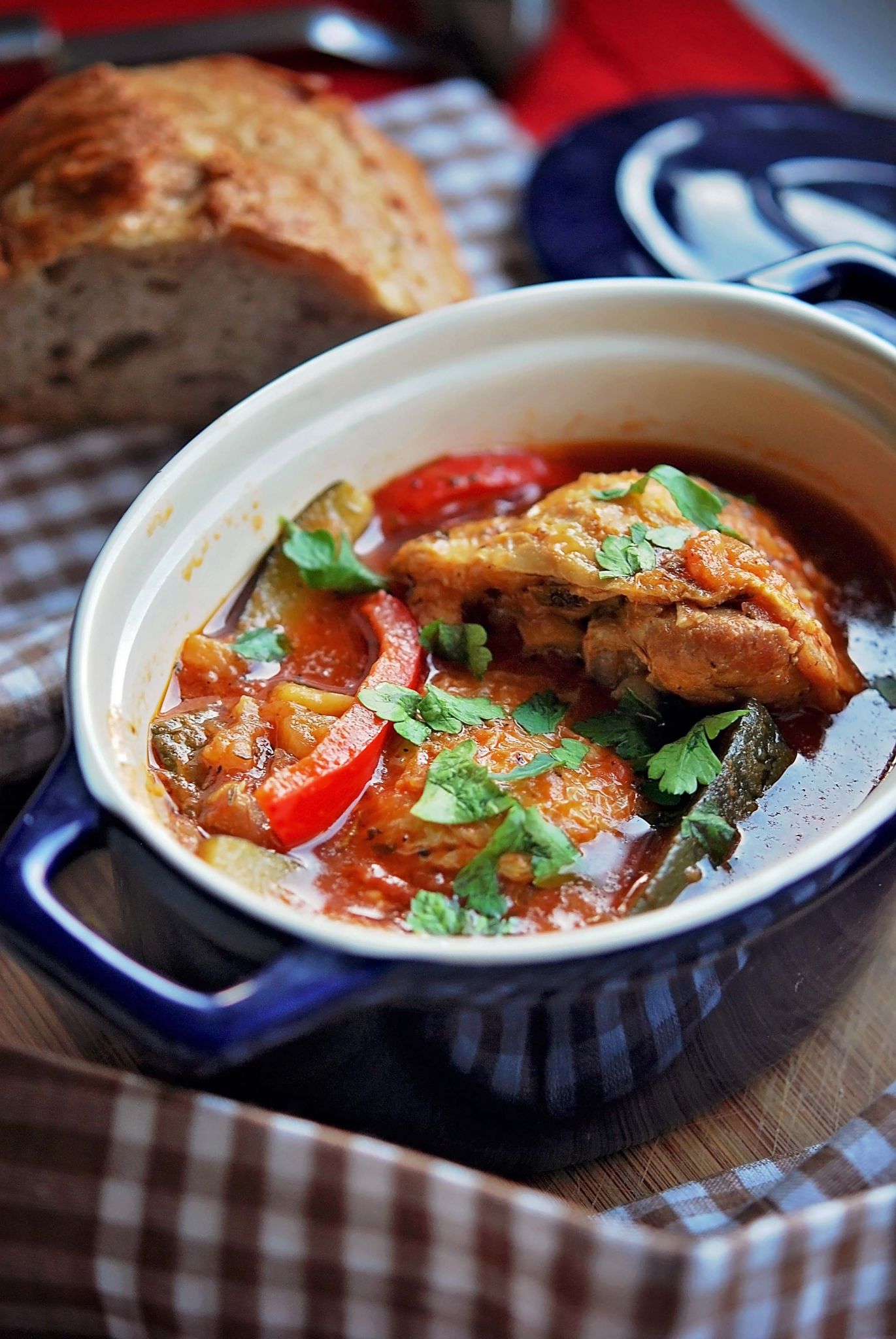 3. Stir in the tomato, bay leaf, herbs and wine, and return the chicken to the pan. Bring to the boil, then cover and simmer over low heat for about 45 minutes. Season well.chicken in samfaina sauce