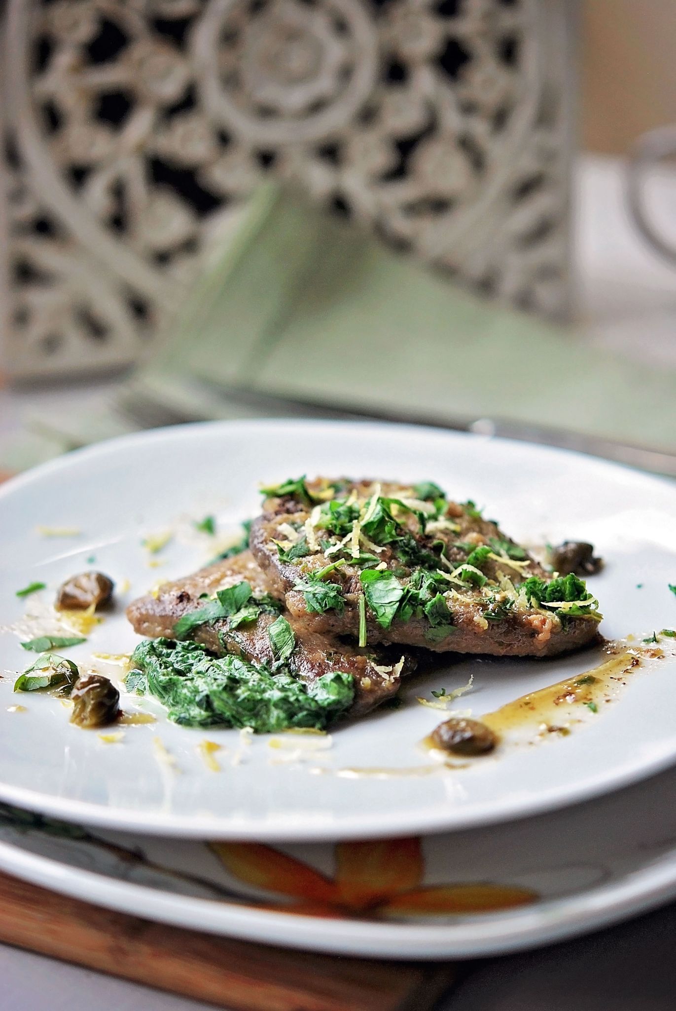 veal escalopes with lemon, capers and spinach puree (piccata al limone)