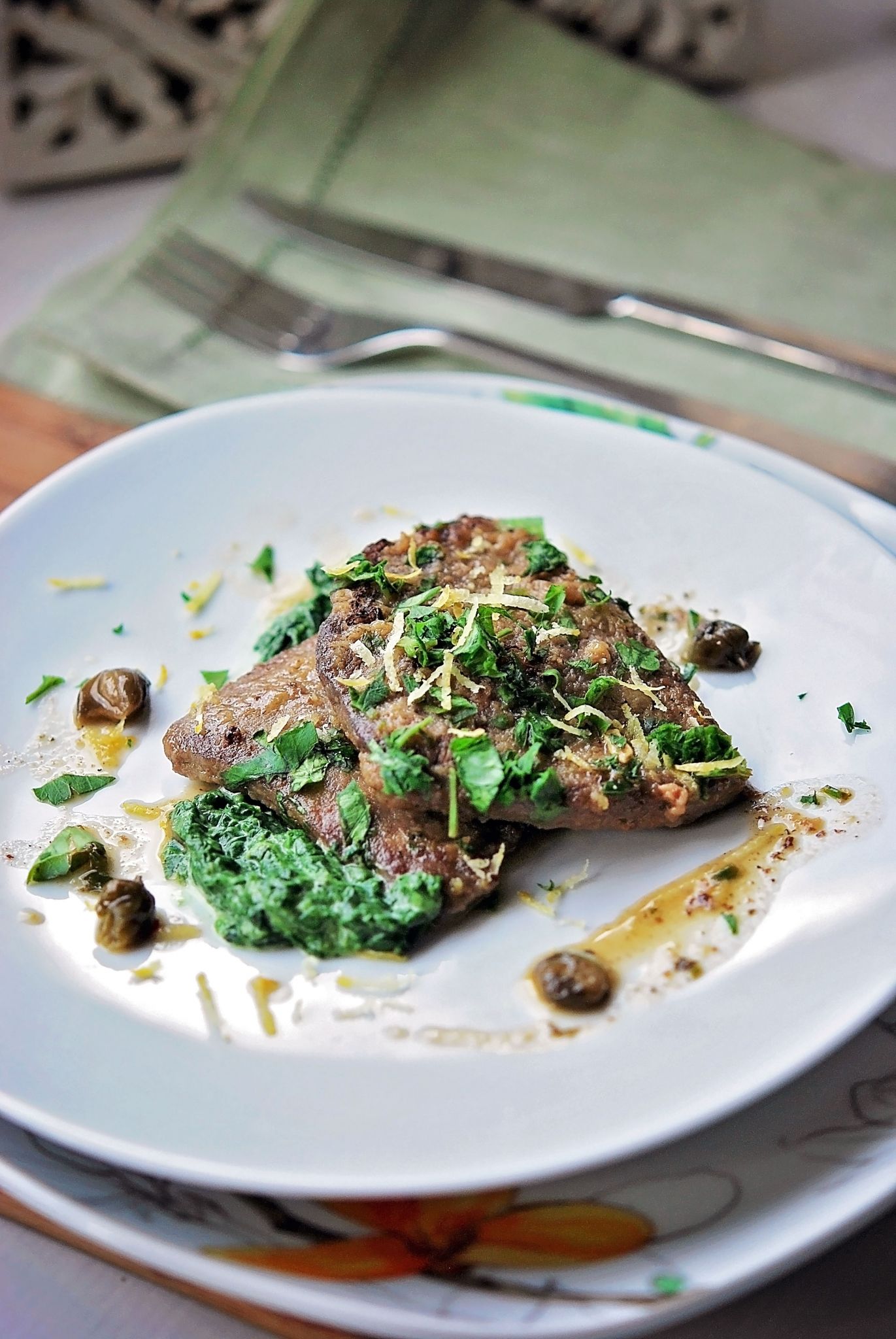 Veal escalopes with lemon, capers and spinach puree (piccata al limone)