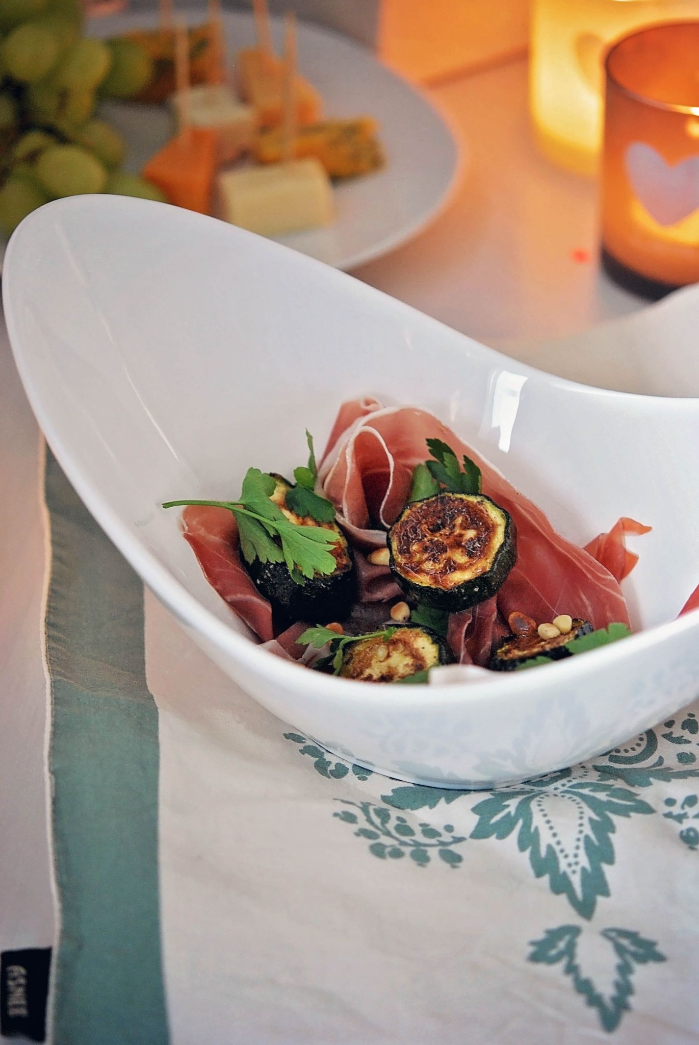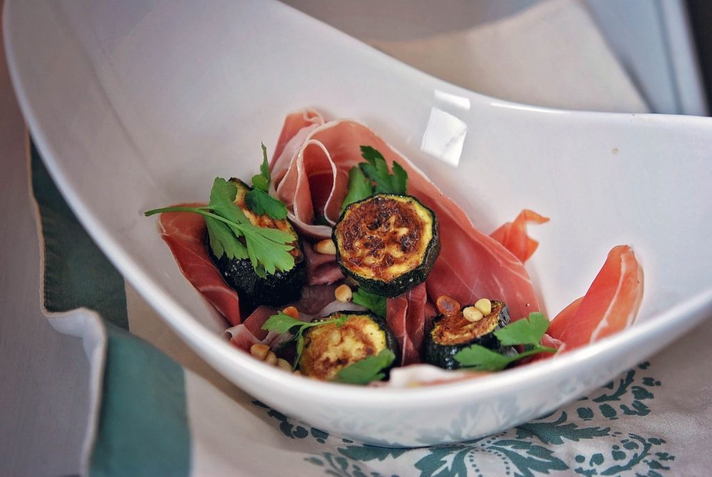 3. Arrange the slices of prosciutto and courgette on individual plates. Drizzle over the sweet and sour dressing and scatter over the pine nuts and parsley leaves. Serve warm or at room temperature.Grilled courgette with prosciutto salad