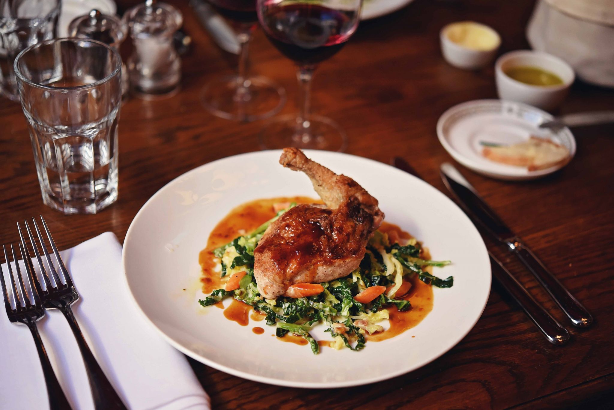ROASTED GUINEA FOWL SUPREME, CREAMED SAVOY CABBAGE, BACON LARDONS AND JUS ROTI
