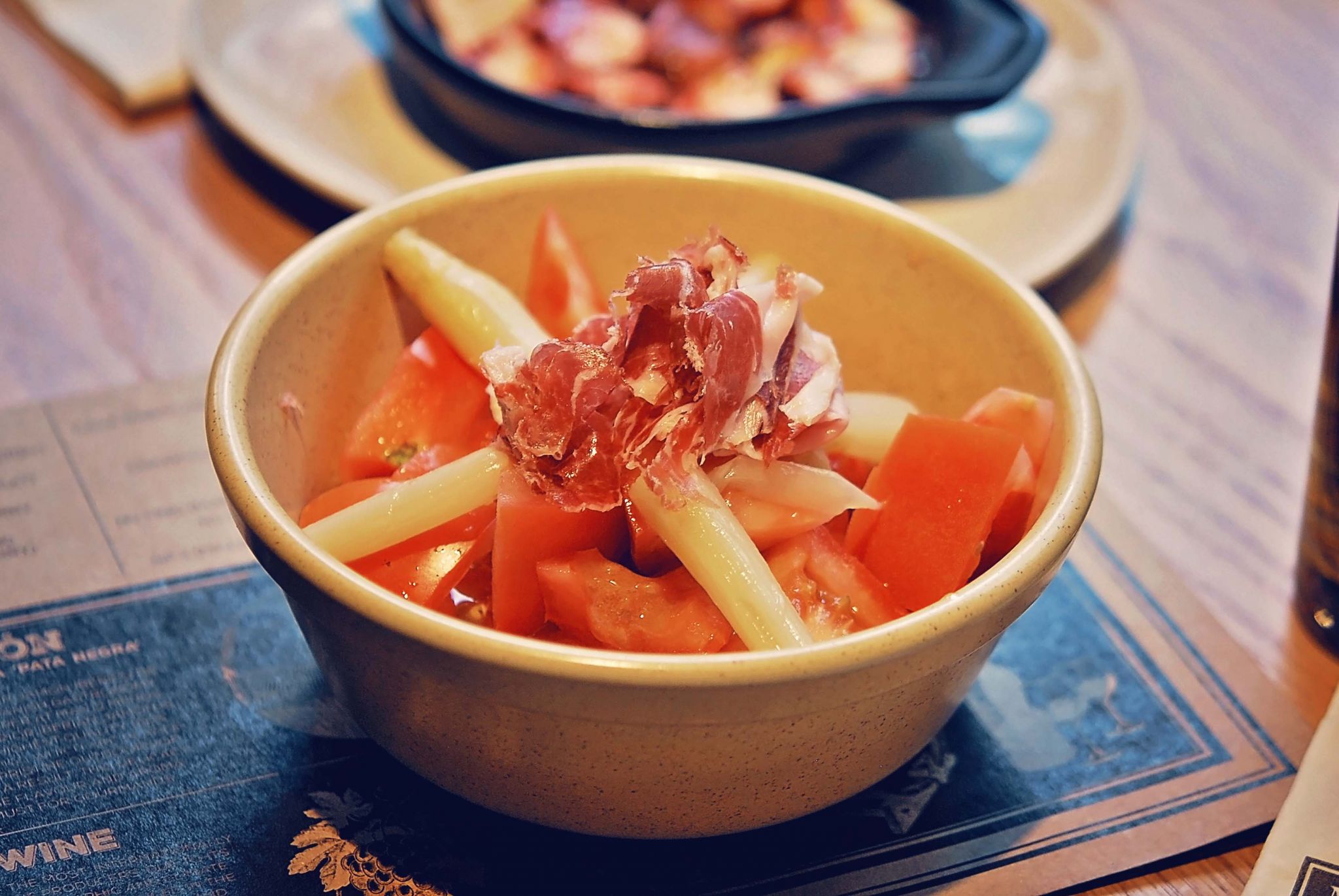 Mas Q Menos, LondonAsparagus, seasonal tomatoes and jamón bellota salad