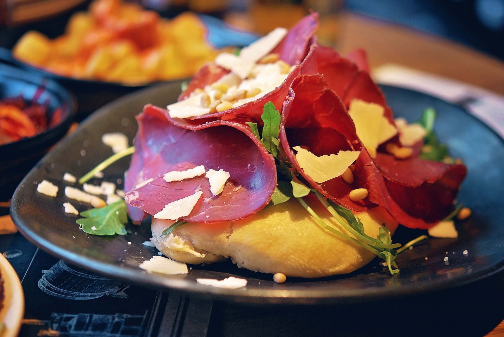 Mas Q Menos, LondonCocas with bresaola, rocket, seasonal tomatoes,  Parmesan cheese, pine nuts and vinaigrette Mas Q Menos, LondonCured Manchego cheese