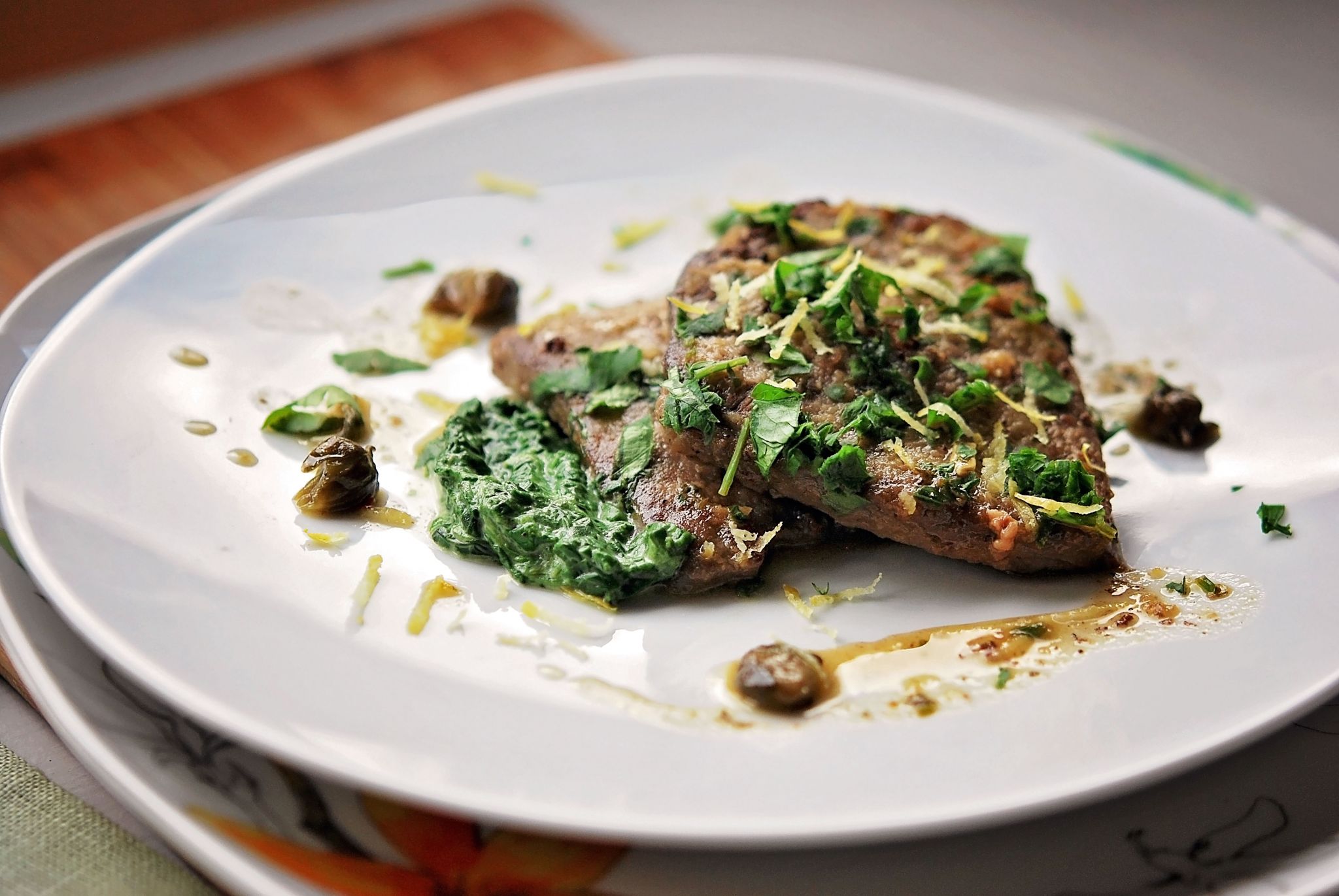 Veal escalopes with lemon, capers and spinach puree (piccata al limone)
