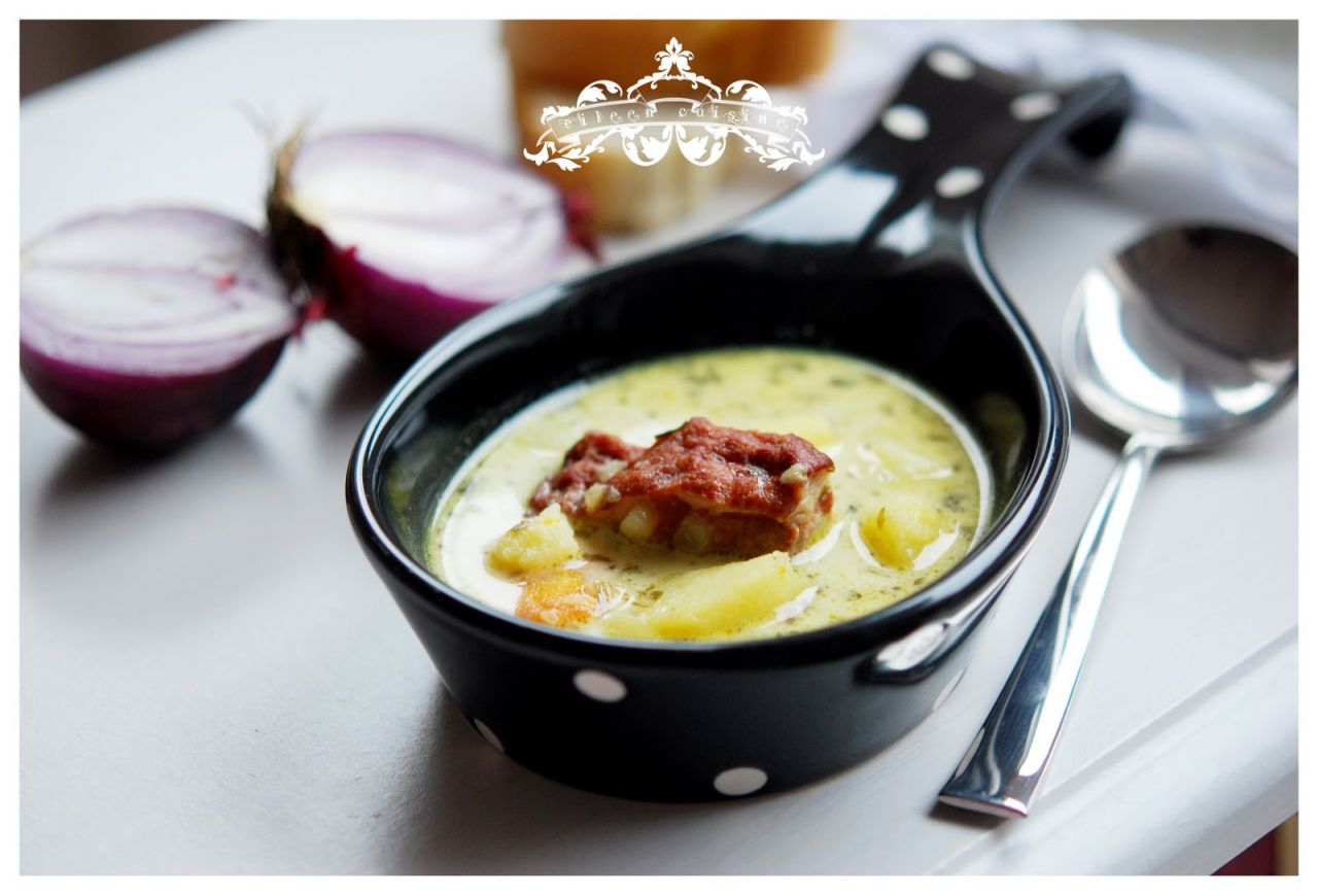 Potato sour soup with ribs and creme fraiche