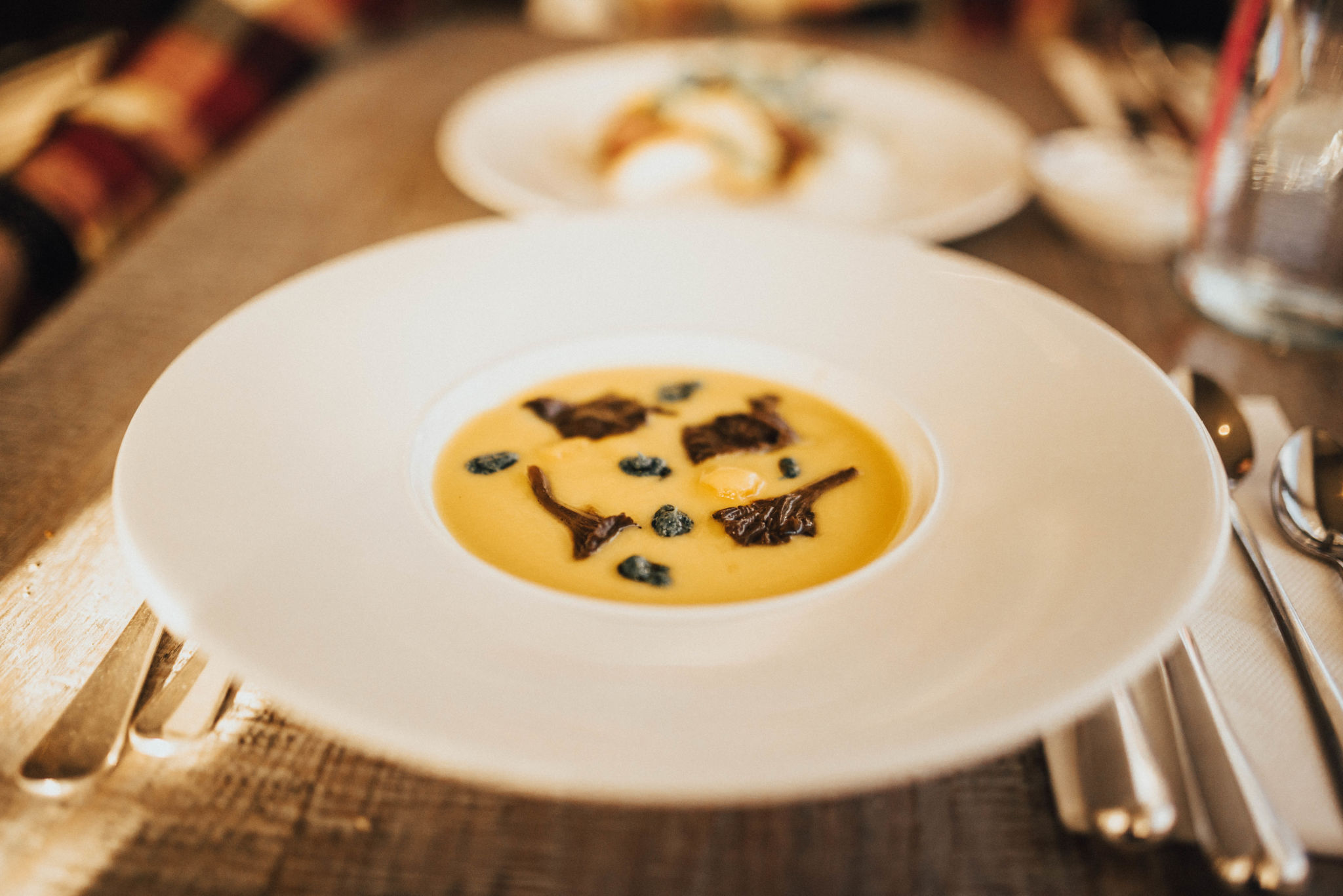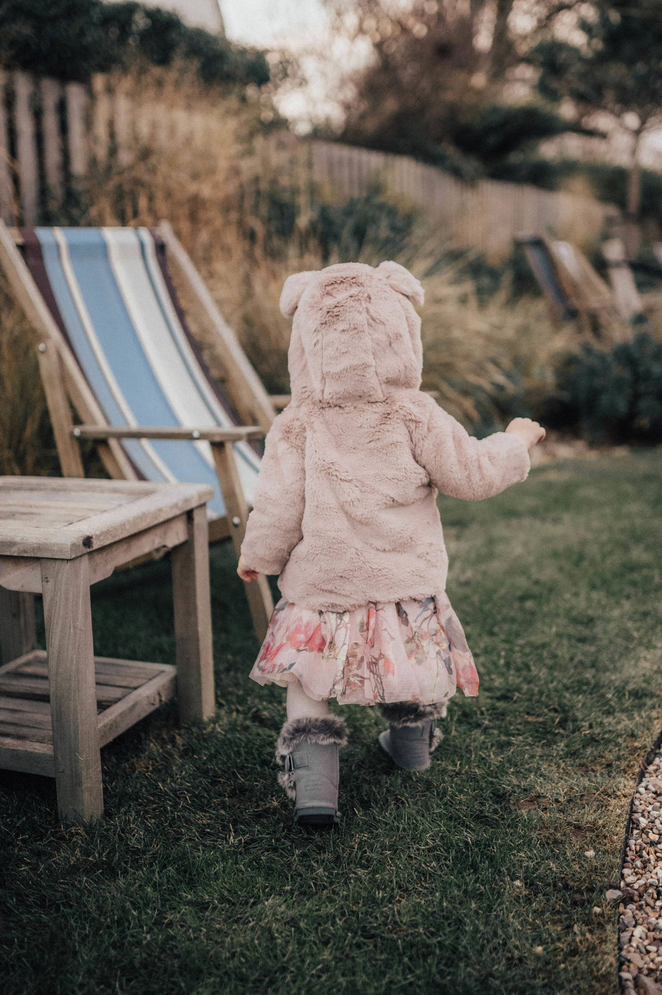 Because we ended up going on a break in November, the weather was terrible, as you would expect anywhere in England. Still, the place didn’t loose any of it’s appeal, moreover, it felt really cosy and warm. I wasn’t at all sad to be spending the entire time in my room. Emma loved exploring every little corner, and I was quite attracted by all the little details that made the room feel stylish and coastal: the handmade beds crafted from recycled timber, framed vintage swimming costumes and eclectic book collections.  The rain and the cold didn’t stop us from enjoying the fresh air from our deck, where the coastal gardens are for exclusive use of the guests and also home to the Beach Hut, a spa treatment room and peaceful oasis to benefit from a deeply relaxing massage or facial. The private deck is majestically overviewed by the French doors opening onto the communal coastal garden. You can enjoy your breakfast in the morning here, or lay in the sun in the summer.  The hotel staff is really friendly and at your disposal every time you need help. Quite informal, which is definitely my style when talking about accommodation, the receptionist was really helpful showing me around. The reception and restaurant have the same sleek yet laid-back Hamptons style: a chalkboard showing with the daily weather forecast; complimentary flip flops, wellies, wraps and towels to take to the beach; complimentary afternoon tea served in the restaurant, all speak about a highly welcoming team.  The beachfront hotel should also be on the radar of any foodie, because it boasts an award-winning restaurant. With a mix between beach hut and Scandinavian, the restaurant sources most of its fresh produce within 10 miles. Featuring the largest collection of English sparkling wines in the country, as well as a seasonal menu blending French dishes with a British twist. We absolutely loved our lunch and dinner there! I had an amazing squash soup with pickled mushrooms, which Emma loved; the best pan fried turbot with veggies, and my husband absolutely loved his pork belly (we even had a little bit of a quarrel about who to finish the crispy crackling). Such an amazing gourmet experience. They are really child friendly too. Emma had a delicious macaroni with cheese, which I had to finish (big portion). It’s my least favourite dish ever, but that one was so delicious, I wanted to ask for seconds! Breakfast is generous, you can pick anything from homemade granola, pastries, to fresh omelettes, and Bloody Marry.