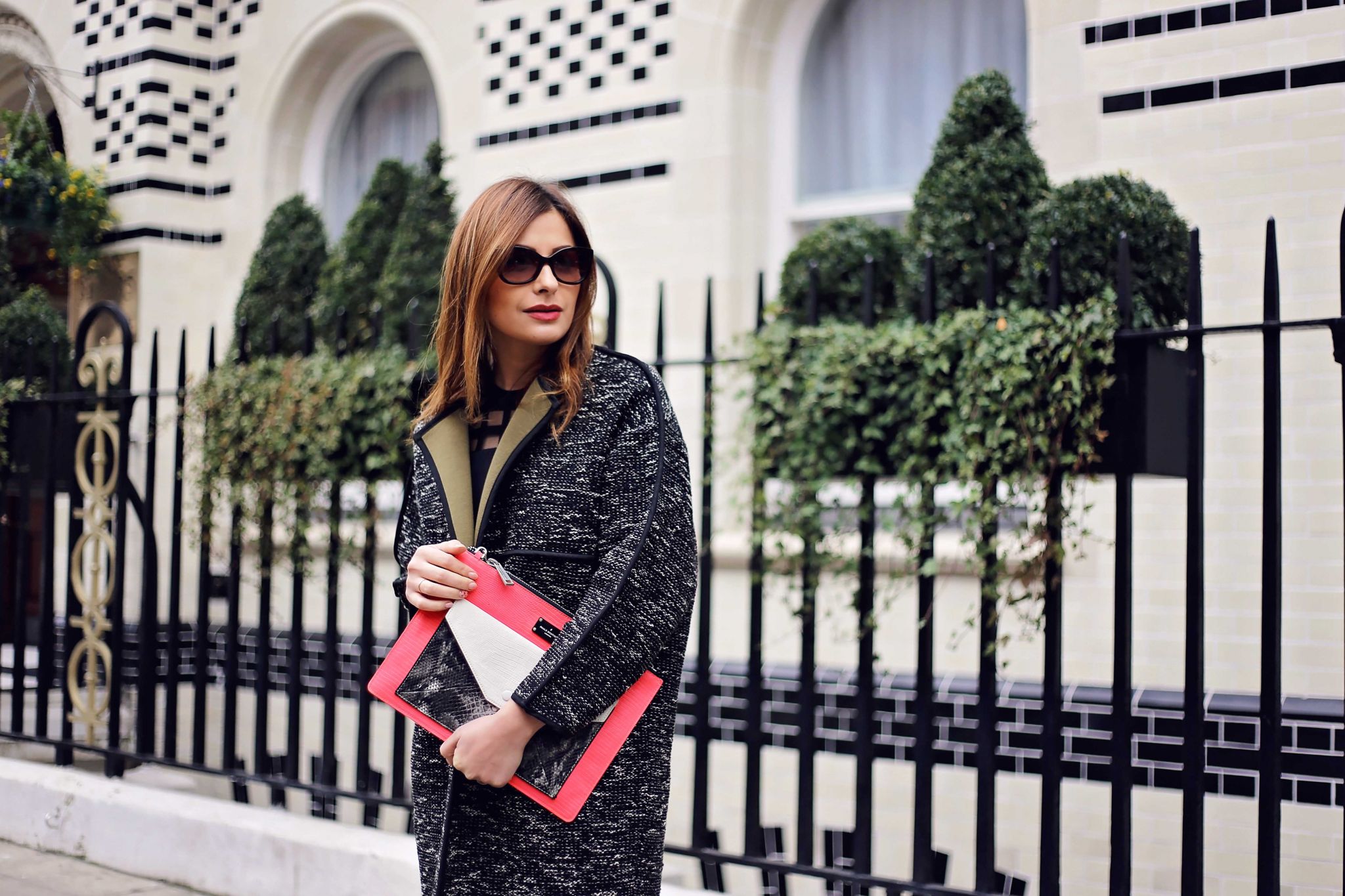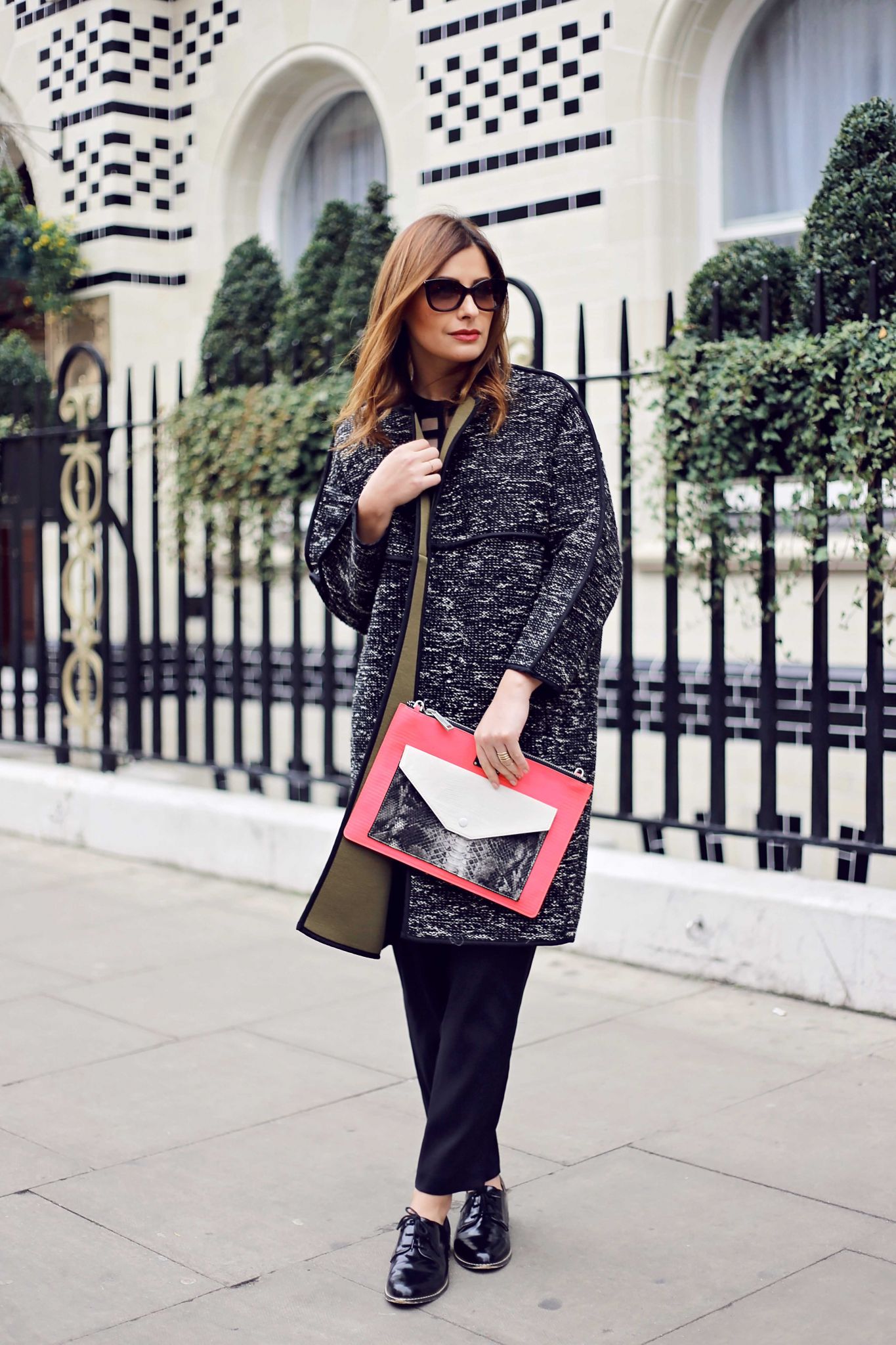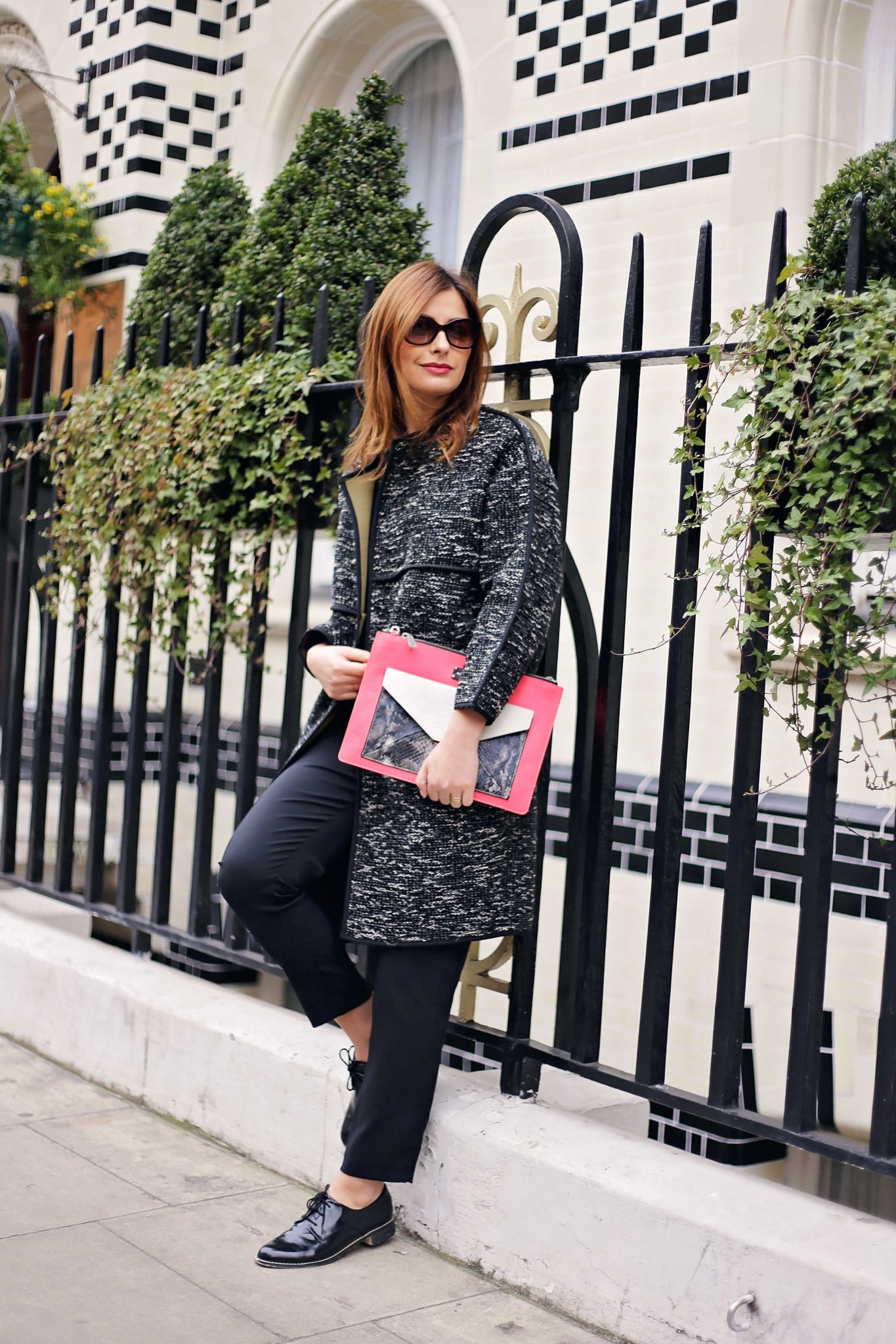 Wearing Topshop jumpsuit, coat and brogues/Paul’s Boutique clutch (buy here)/Just Cavalli sunglasses