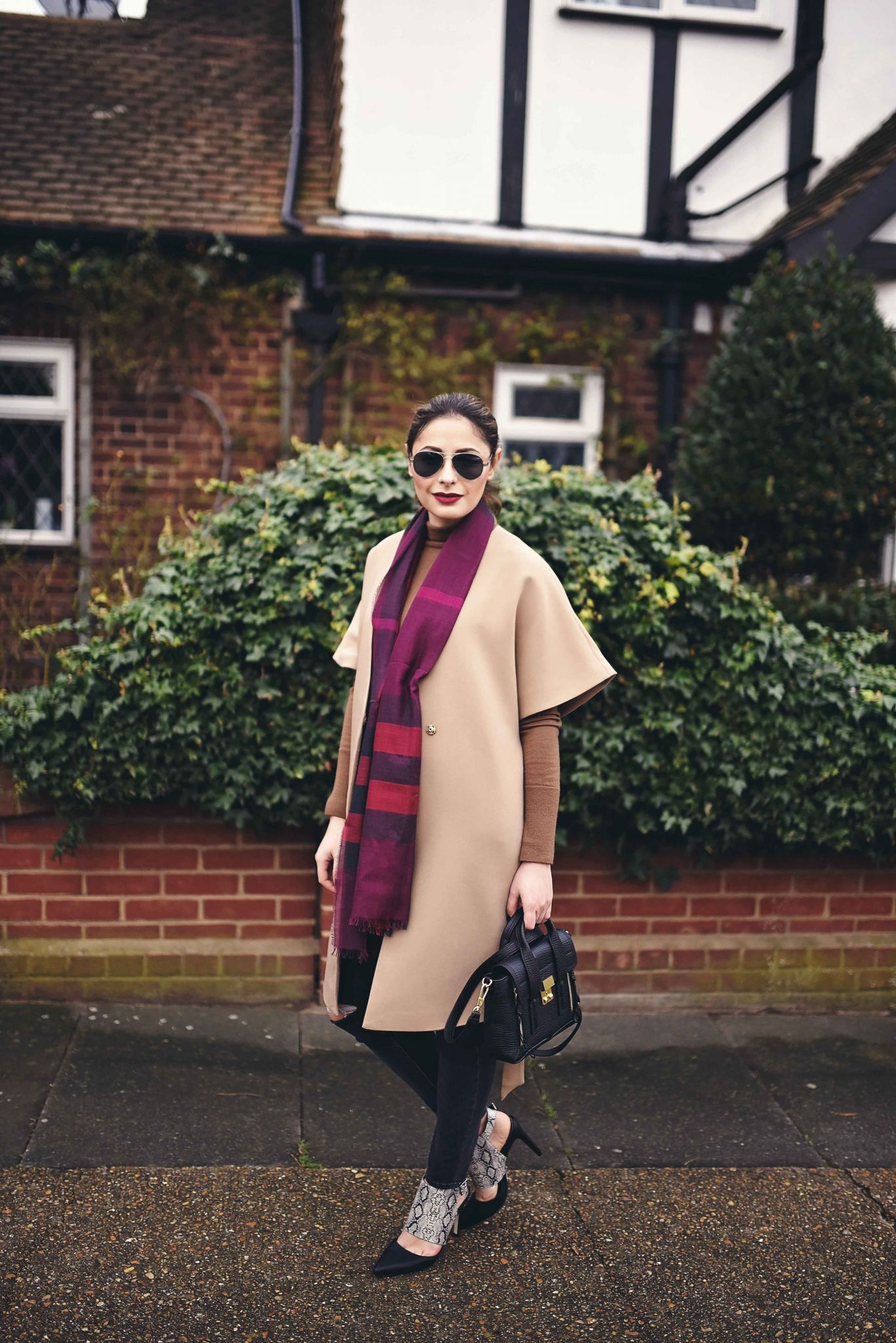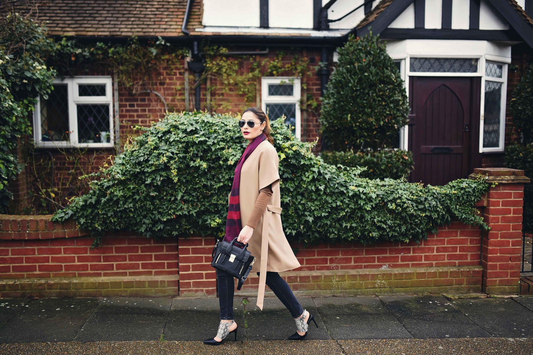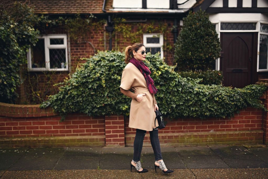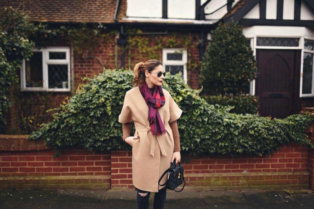 We all have some guilty pleasures, either eating the finest chocolate, or spending money on lots of beauty products, just to name a few. Mine is havingĀ an impressive collection of coats. This happens probably because living in London gets cold mostly all year long, and you need to stay fashionable, but still cosy. Meaning, changing a lot of jackets, dusters, fur coats, gilets, and kimonos. Luckily, next season is all covered by the launching of Girls on Film SS16 collection, including beautiful jackets, as well as structural and flowing dresses, aztec prints and faux leather in hot coral. Who can resist a beautiful and affordable new spring collection? I know I can’t, and you should check it out! I am totally impressed with the camel kimono coat available on pre-order, so versatile, glamming up any outfit, definitely the right investment. You can pair it with some ripped jeans for an edgy look, sneak print mules, and a classic Burberry scarf, for that extra touch.