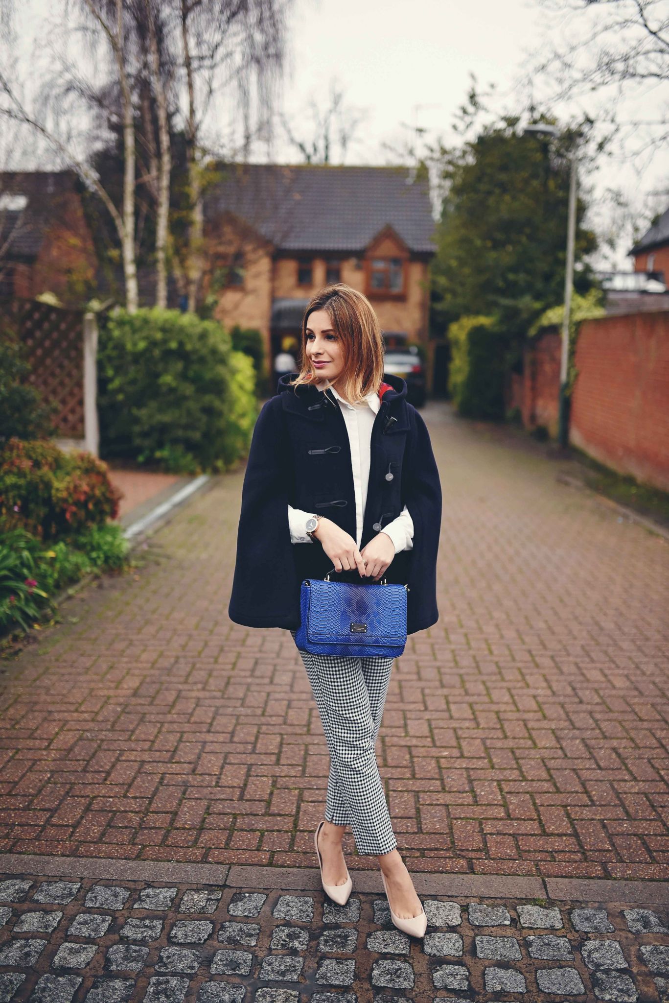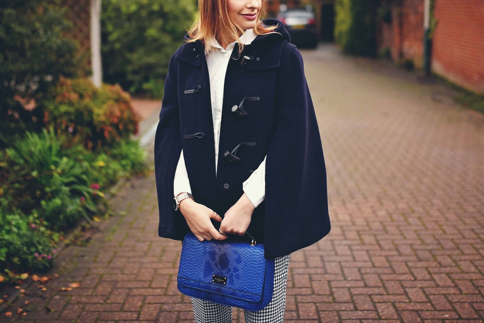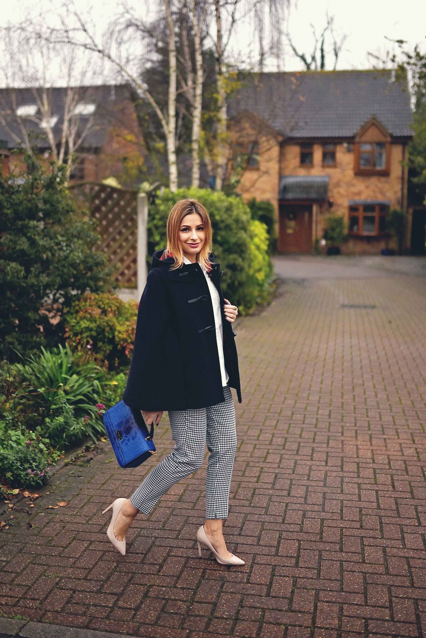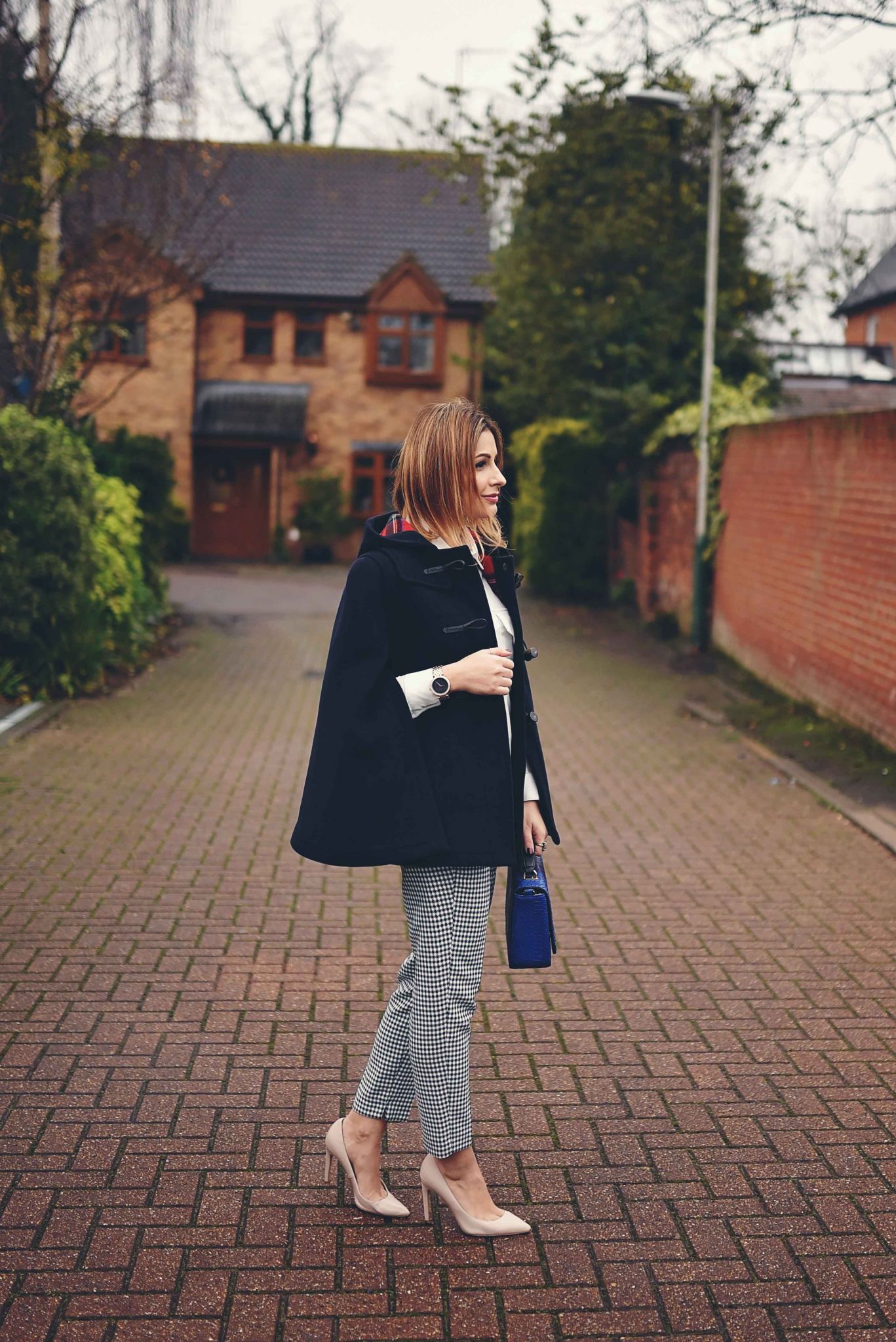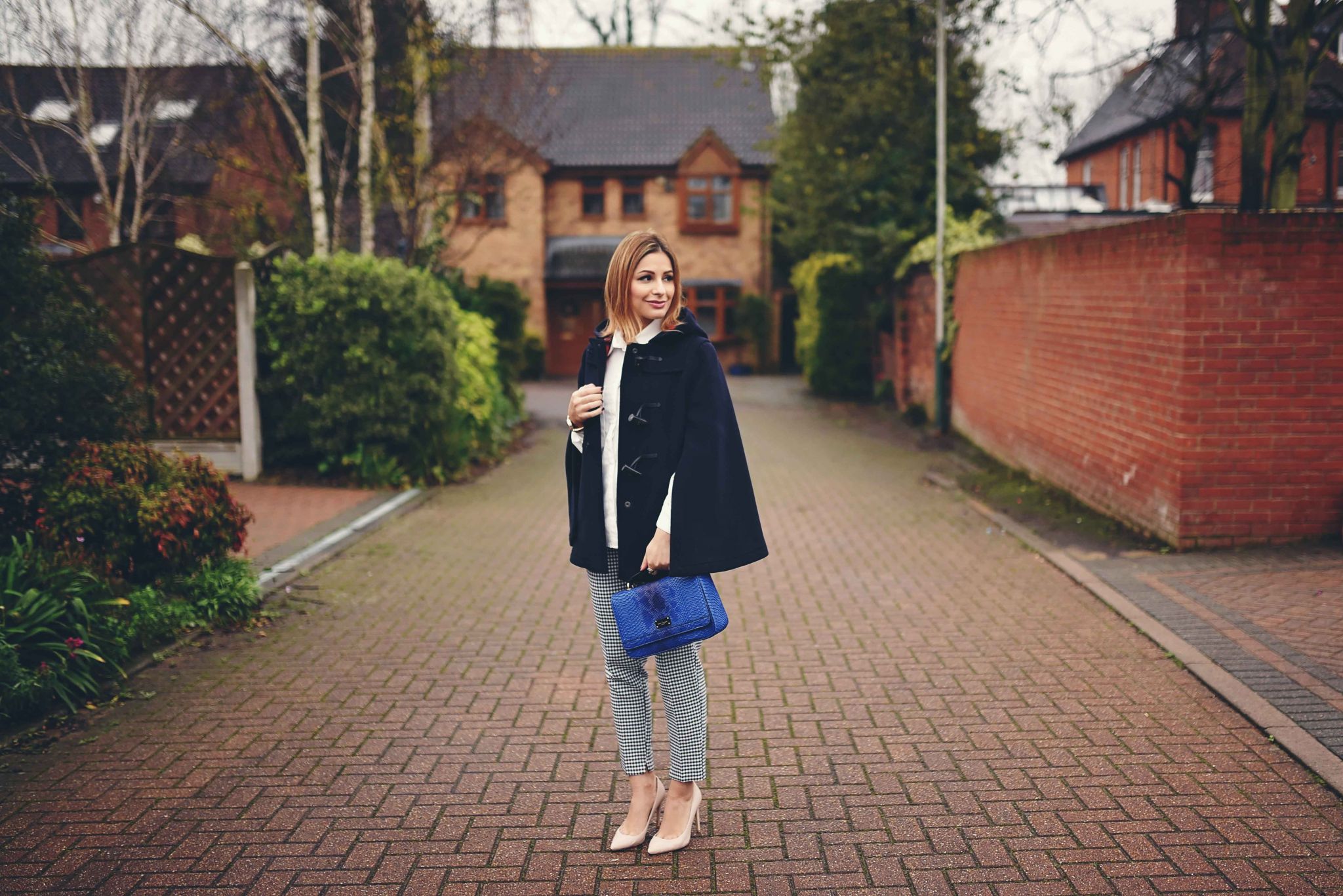 Gloverall has been playing a part in fashion & culture throughout the last 60 years, and it is the archetypal luxury British Designer brand for men and women coats, including capes. I absolutely love my new tartan lining duffle cape in navy from Gloverall, since it channels a traditional British aesthetic with the striking Royal Stewart lining. The quality is exceptional, made from a soft, warm and durable wool blend, featuring full-length batwing sleeves, lined hood pop button and toggle fastening, it can be dressed up and down. At first I thought about styling it with a pair of riding boots, skinny jeans and a hunting rifle, which would look incredible, but then again, I wanted to step up the game a bit and prove you can look stylish wearing a sportier cape to an elegant outfit.
