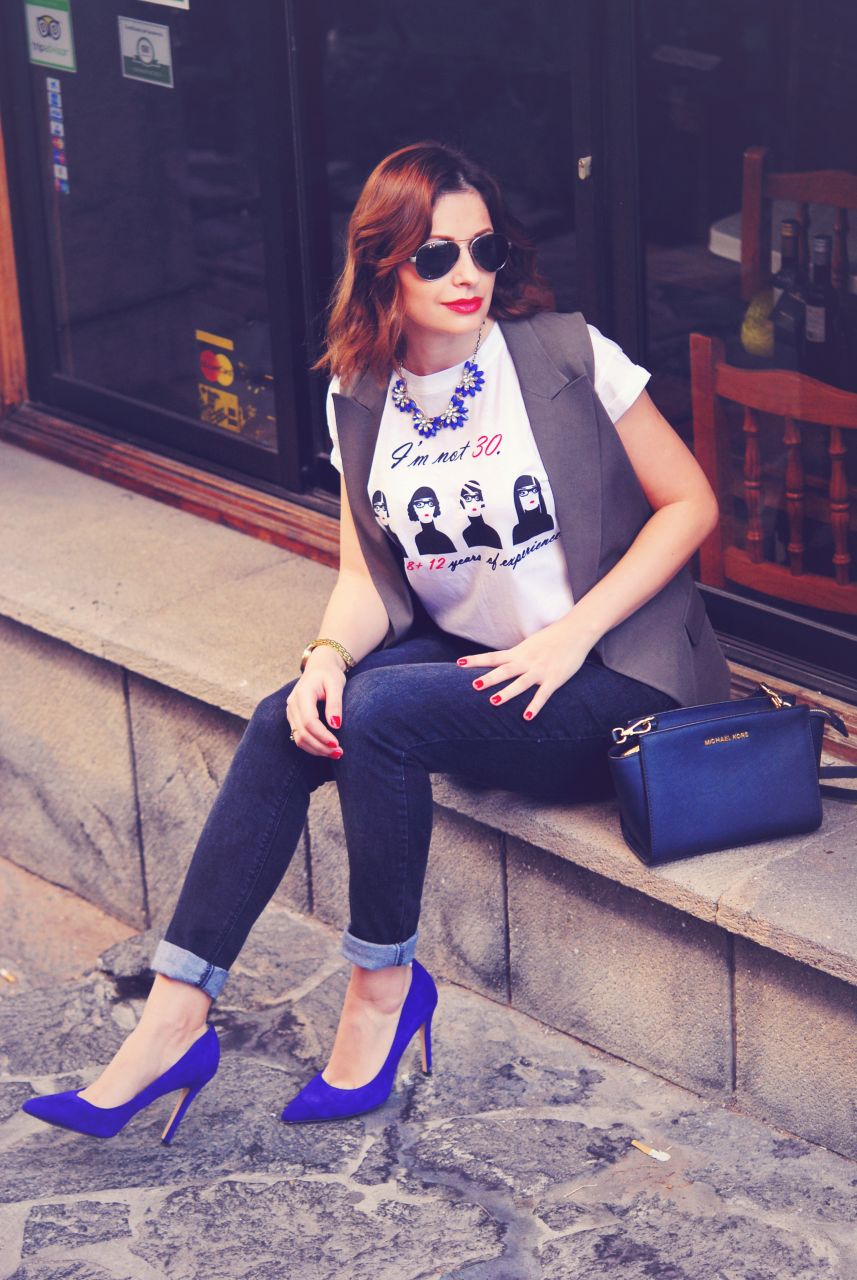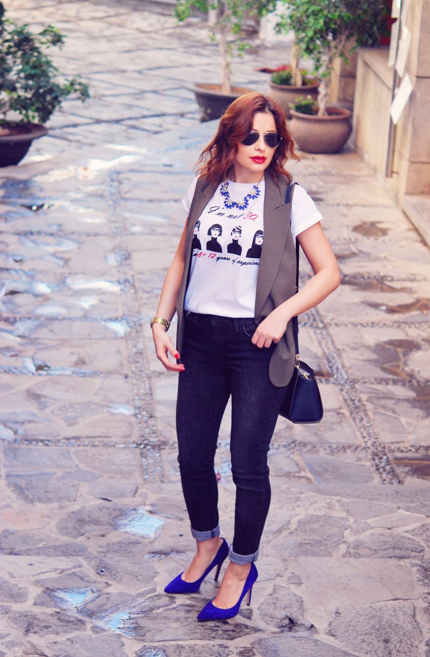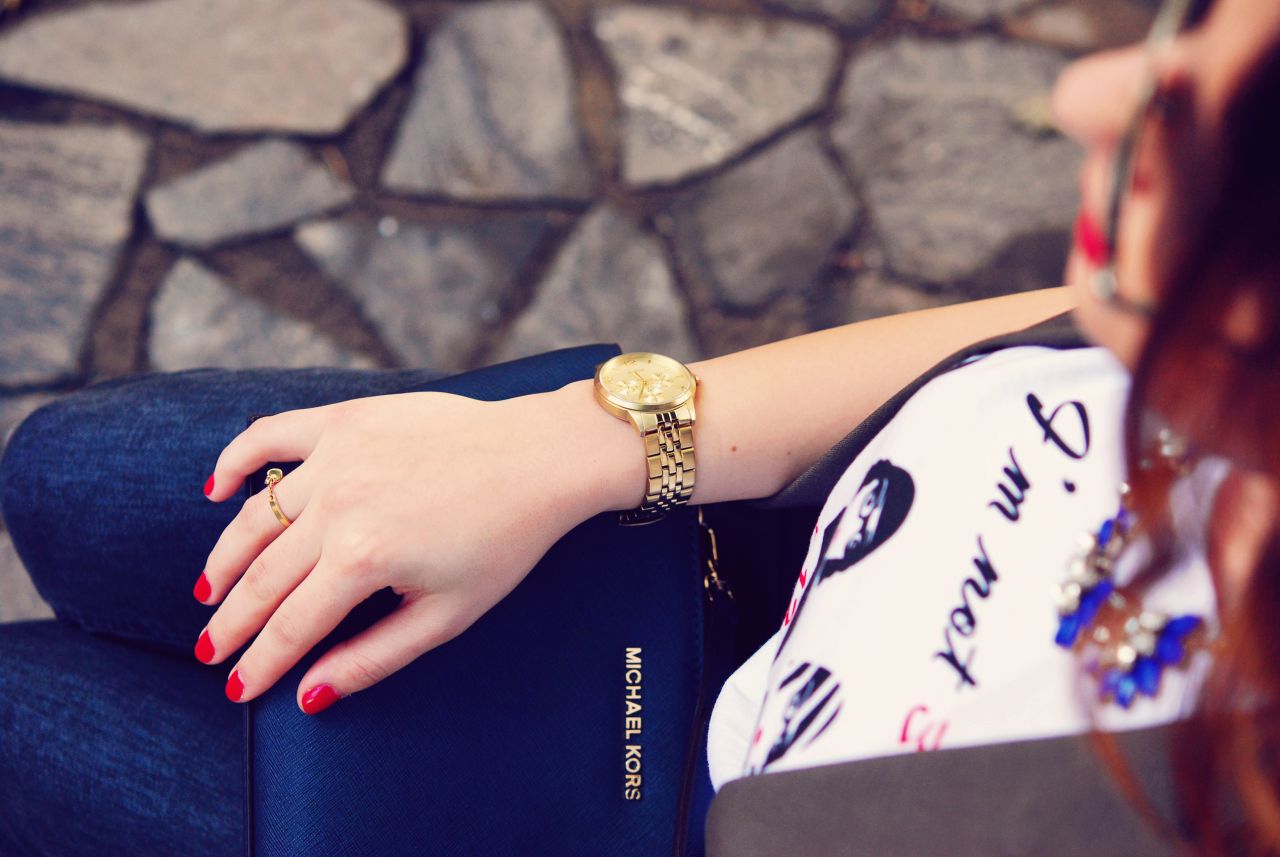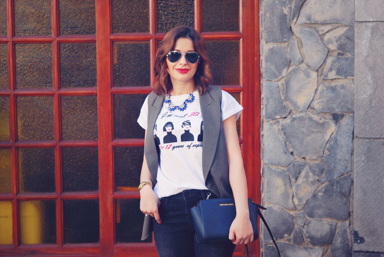 Andreea Raicu t-shirt/Theory vest/River Island by Rihanna jeans/Next necklace/Vince Camuto heels/Michael Kors bag/Guess watch and sunglasses/Topshop ring
