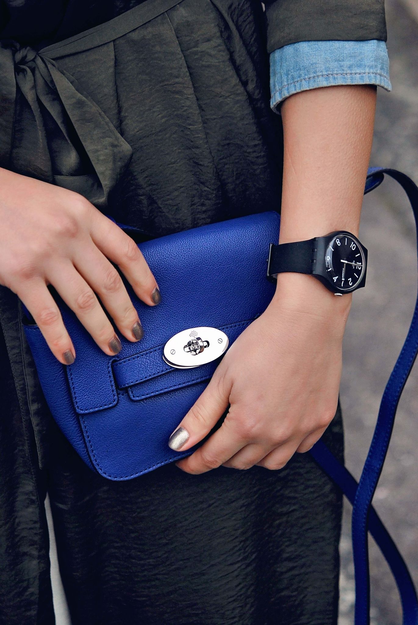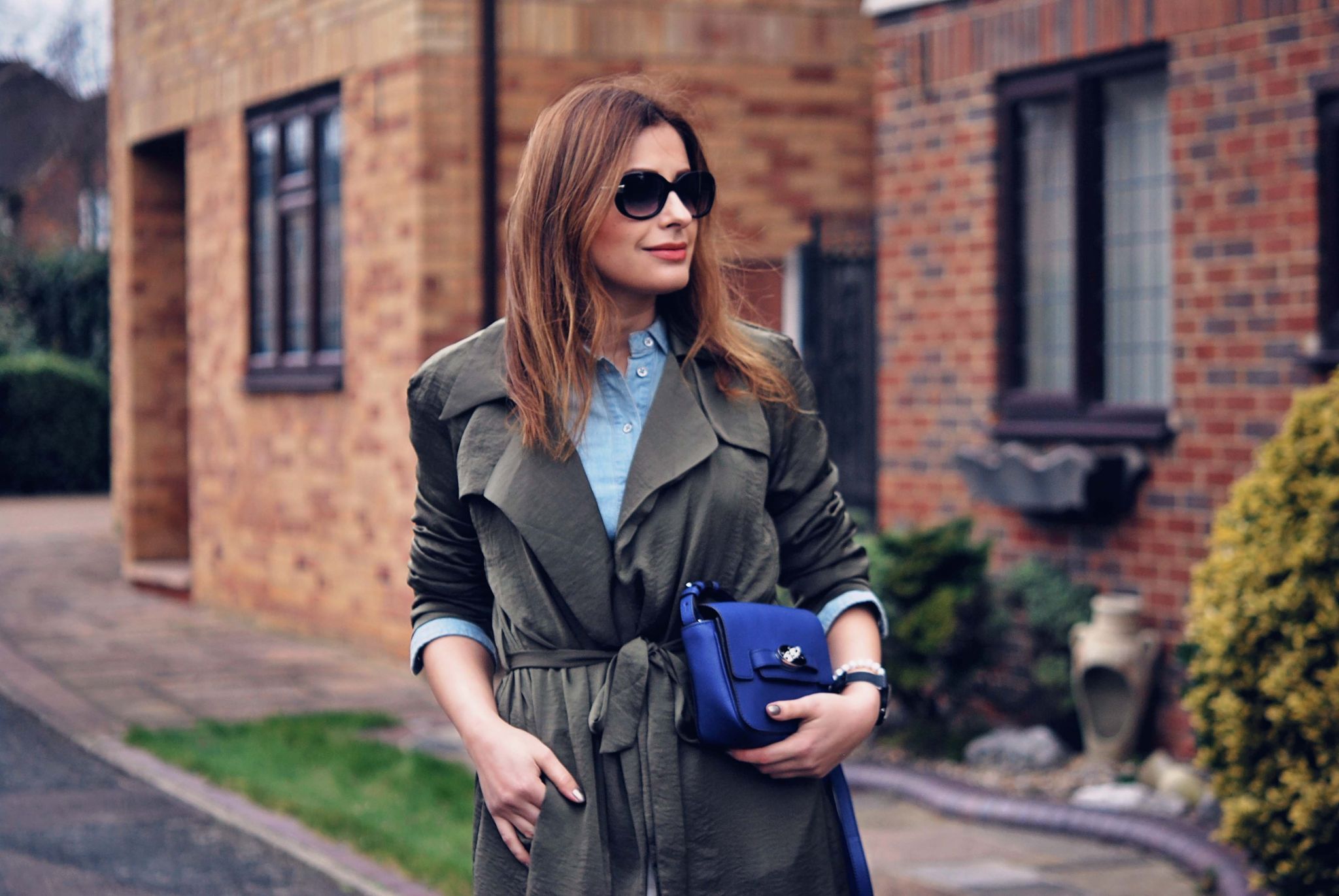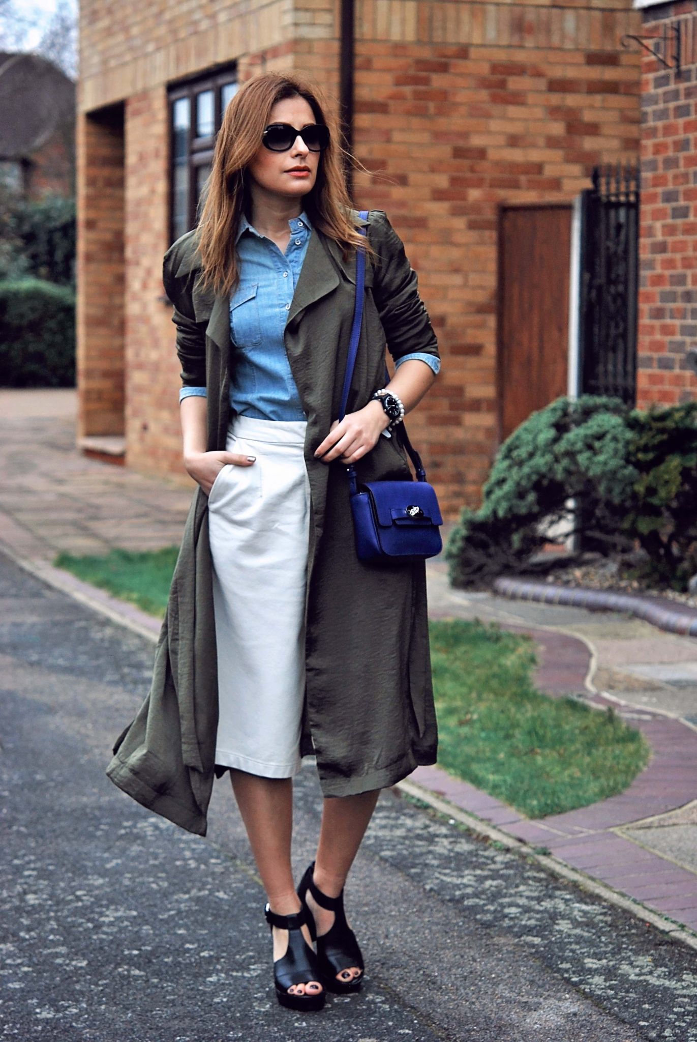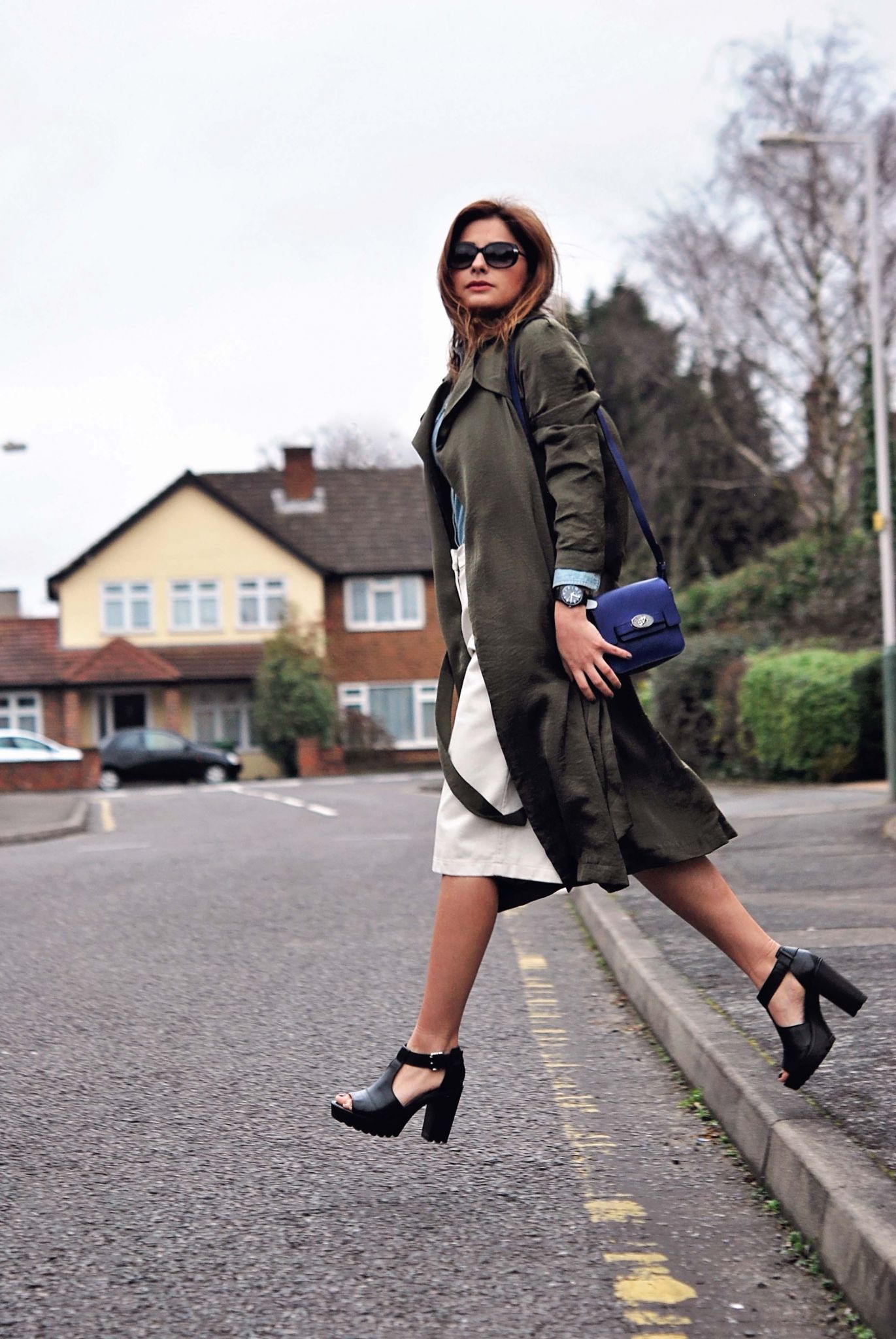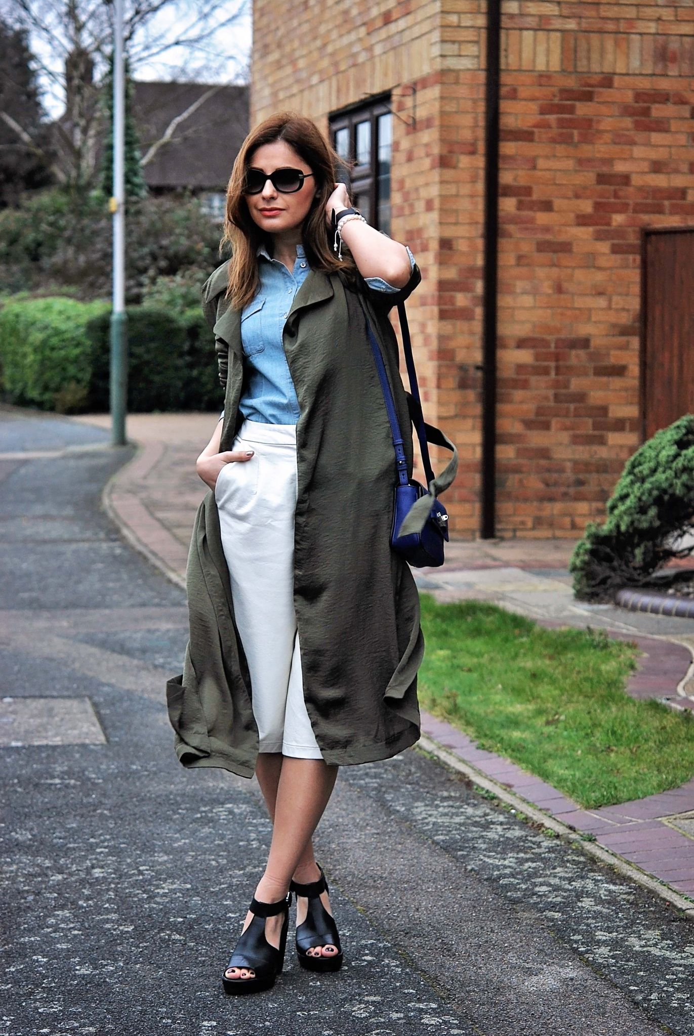 The utilitarian trend has been taking with aplomb the catwalk this season, and we love it! It is refreshing to see relaxed outfits, that are all about army influences, khaki hues, studded finishings and of course, that much-loved Camo print. I went for an edgy look with my favorite duster coat from Little Mistress, with a nice satin finish, that I will be taking out for a spin a lot this spring. The leather culottes matched with a denim shirt, add a vibrant sporty influence to the entire outfit. The accessories are at a minimum. All you need is a classic all black Swatch and you are ready to run to your chores.
